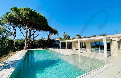 This villa offers a private outdoor space with a pool, a garden, an open terrace, a covered terrace, a barbecue, and an outdoor shower.
