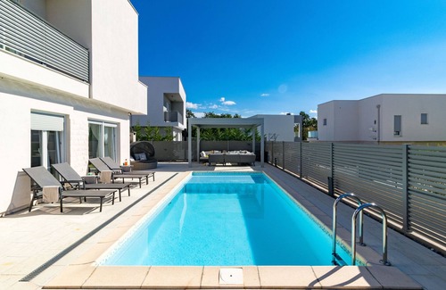 Modern single-family house "Villa Virtus", 2 storeys, built in 2016. 4 km from the centre of Novigrad, 8 km from the centre of Umag, 24 km from the centre of Poreč, in the residential district, from the sea, 200 m from the beach. Private: property 500 m2 (fenced), swimming pool angular, heated (8 x 4 m, depth 145 cm, seasonal availability: 27.Mar. - 05.Nov.). Outdoor shower, hot tub, terrace, garden furniture. In the house: internet access, roof terrace, burglar alarm system, washing machine. Parking (for 2 cars) at the house on the premises. Shop 200 m, supermarket 4 km, bus stop 290 m, rocky beach 200 m. Marina 8 km.