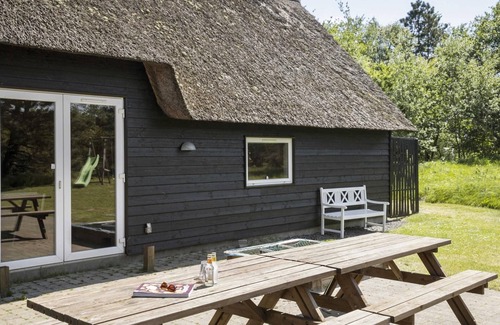 This text describes a luxurious holiday home in Rømø, surrounded by stunning natural beauty. The house, built by Skanlux, features a thatched roof and offers a unique vacation experience, especially for water enthusiasts. It boasts a fantastic pool area complete with a water slide, a large whirlpool, and a sauna. The house is spacious, with three separate sleeping areas, each with two to three bathrooms and a bedroom. It also includes a loft that can accommodate additional guests. The living room is comfortably furnished, featuring a wood-burning stove that adds to the cozy atmosphere. Beyond the central dining/living area, there\'s a large activity room equipped with darts, a pool table, table tennis, and table football. The house is situated on a large natural plot, perfect for enjoying summer evenings and gathering around the fire pit. Rømø is known for having one of the best bathing beaches on Denmark\'s west coast, with the unique feature of being able to drive your car right down to the water\'s edge.