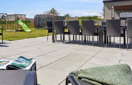 This text describes a luxurious holiday home in the scenic village of Ålbæk, near Skagen, known for its beautiful beaches and vibrant town life. The house can accommodate up to 30 people, making it ideal for large families or groups of friends. It features 12 bedrooms spread across four sections, one of which is a family room with a double bed and a bunk bed, with a bathrooms in each quarter, and an additional bathroom near the pool area. Two lofts provide extra sleeping space, particularly popular with children and young people.The house boasts an extra-large kitchen equipped with two of each essential appliance and a wine fridge. A long dining table in the living room provides ample space for communal meals. The living area offers numerous comfortable seating options.For entertainment, there\'s a large activity room with games like billiards, table tennis, darts, and table football. Wireless speakers throughout the house allow for a musical backdrop. The house also features a 23 m2 swimming pool with a water slide and counter-current system, an outdoor whirlpool, and a sauna. An outdoor shower is available for year-round use.The wooden terrace includes a luxury grill and garden furniture, and a lounge area for relaxation. Children can enjoy a playground with a sandbox, play tower, slide, and in-ground trampoline. The house shares a multi-purpose pitch with the neighboring house for sports like football, basketball, and volleyball. The house also has a charging point for electric cars, but guests need to bring their own cable.
