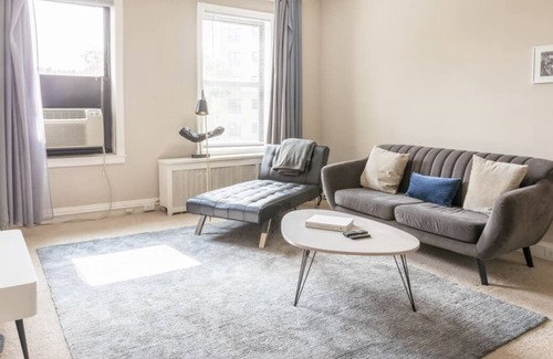 Steps away from Lake Michigan? Perched on the edge of Jackson Park? Plush accommodations in a historical building? Why, yes—all that and more. When you choose to stay in this one-bedroom loft, prepare to enjoy a full kitchen, homey living room, and luxurious queen bed. Plus with that wide-screen TV, take the night off to re-watch your favorite flick. Or, explore University of Chicago, Museum of Science and Industry, and the Hyde Park shops, small businesses.