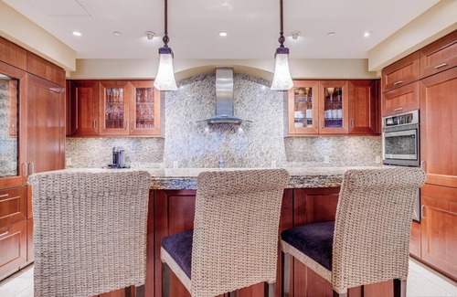 Discover for yourself why D301 is one of the most requested Villas in our vacation rental collection. Impressive artwork by internationally known Maui artist Elan Vital provides a fabulous backdrop to the welcoming great room in rich jewel colors of amethyst and jade furnishings. This three bedroom three and a half bath Villa features luxury appointments to create an elegant contemporary Asian influenced ambiance. Plush warm, rich custom paint Ralph Lauren textured walls give the entire vacation home a radiance. The front private lanai offers unobstructed ocean views for sunset or whale watching, and even a complimentary show of the luau at the neighboring resort. The top-line kitchen features a 5 burner gas stove fashioned to culinary height and a full size wine refrigerator.
