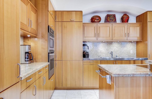 The kitchen, considerately furnished with useful house wares, top-brand appliances, and cooking accessories, makes meal preparation a breeze. Luxury appliances include two Sub-Zero refrigerators with freezer drawers, Gaggenau Ceran cook top, Thermador stainless steel convection and microwave ovens, Bosch electronic dishwasher, specialty coffee maker and grinder, blender, electric teakettle and toaster.