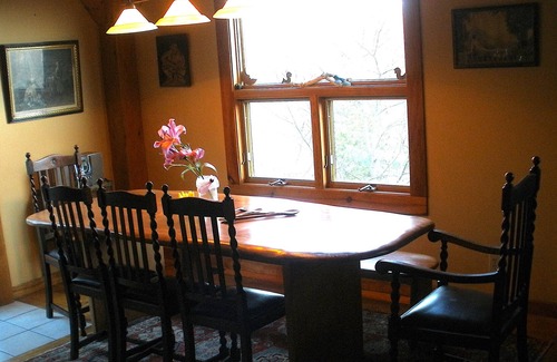 Above the main floor, there are 2 additional levels where there are 5 bedrooms 2 with Queen size beds, & 2 with Full size beds, 1 with bunk beds, & 2 Full size couch futons in the living-room (6th bedroom). Fold-up mattresses for the floor, are available if additional sleeping arrangements are needed. Depending on how your group is configured & how the bed space is utilized, we have been able to accommodate up to 15 people at a time. Please note, that we would need to communicate regarding this, so that we can prepare accordingly. Please give us advance notice so that we can make all of the necessary arrangements so that everyone will be comfortable. We provide linens & towels for your convenience. We have DSL & wireless internet if you bring your own devices, ie computer, etc, & there is a flat screen TV here for on-line streaming. Water is hot & cold, & is plentiful straight from the mountain to the well to you. There is laundry in the basement if needed upon request, however, the basement is reserved as utility space for owner use & is not part of the rental.