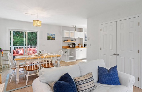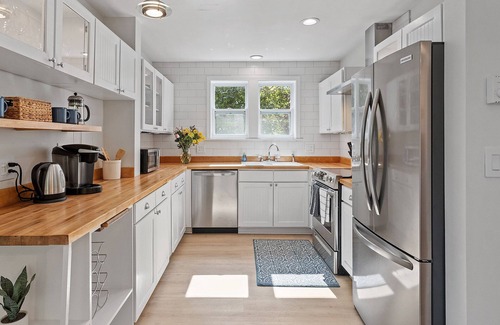 The “Captain’s Cottage” on Tuckerman Ave has just been completed in time for summer 2023! This stunning, yet charming newly remodeled home is located in an idyllic setting and is the perfect backdrop to your summer vacation in Newport. It boasts a bright and breezy open layout that abounds in natural light. The cozy kitchen features top of the line appliances, butcher block countertops, a convenient coffee station, and windows that look out at the lush, park- like setting. Take your morning coffee outside onto the spacious new deck and relax in comfortable seating while enjoying the privacy. Two off-street parking spaces are provided, as well as an extra space for day time visitors. Laundry is conveniently located on the main level. This home is located in the most ideal spot on all of Aquidneck Island. You'll love being able to walk to both First (Easton's) Beach and Second (Sachuest) Beach, as well as Newport's world famous Cliff Walk! You can also walk to several popular restaurants and shops, including Clementine's Ice Cream, Diego's Cantina, and Atlantic Grille for the best breakfast in town. Downtown Newport is only a 5 minute ride, or an ambitious walk away. Upon booking, I'll be happy to share the best sunset spot on the island so you can stroll down with an evening cocktail and take it all in. Each of the two bedrooms has a comfortable queen memory foam mattress. The primary bedroom contains a pocket door that opens up into the newly remodeled bathroom with a beautiful tile shower and tub. The home comes complete with everything you'll need - linens, towels, beach towels, paper goods, wifi, etc. There is a smart TV in the living room for movies, TV, or music. Just book your stay today and pack like you would for a hotel (if that hotel were located on Tuckerman Avenue, that is!)