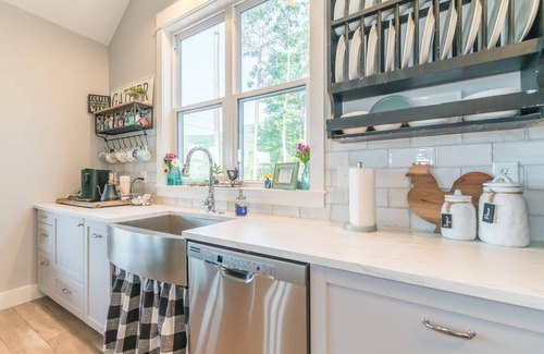 After a day of hiking and sightseeing, enjoy a relaxing evening on the front porch with a glass of wine and wonderful views of Yonah Mountain. We always leave a bottle of local wine to get your vacation off to a great start! You can also walk down to Serenity Cellars Winery and enjoy live music on the weekends! Our custom built cottage offers 2 bedrooms and 2 en-suite baths on the main level with a spacious kitchen as well as a living area and fireplace. There is also a full basement with a kitchenette, another bedroom with 2 twin xl beds and an attached bathroom, and a theater area with a comfy sectional sofa! The spacious basement includes an air hockey table, shuffleboard table, a full-sized arcade game console (5,000 games), and tons of board games as well as outdoor games. There’s something for everyone!