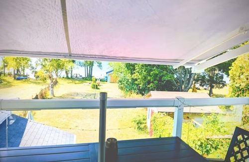 Once you enter the guesthouse, you will see a variety of outdoor games on some shelves, including croquette, badminton rackets, frisbees, basketballs (there is a hoop in the driveway), volleyball, soccerball. When you go up the stairs, you will see a beautiful view of Weller's Bay through large windows looking onto the deck. On the deck is a BBQ, and patio set with 4 chairs and an umbrella. There is also an awning that can be rolled down for enjoying the deck on rainy days as well as scortching summer days as long as it is not gusty.