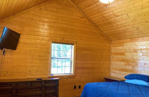 This stunning double master suite cabin has a large front porch overlooking beautiful Lake Livingston that is perfect for enjoying both sunrise and sunset lake views. This cabin features two master suites with full sized bathrooms, a king-sized bed in one bedroom, a twin over queen bunk bed in the other bedroom, a TV in each room with satellite TV, Wi-Fi, living area, and a full kitchen equipped with a microwave, coffee pot, toaster and basic pots, pans, and dishes. There is a fire ring and small barbecue right outside. Linens are provided, but towels are not. Come and enjoy all the comfort this cabin has to offer!