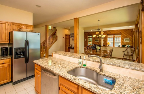 This home sleeps 8 people comfortably with 3 bedrooms and 2.5 baths. All the bedrooms are on the second floor. The master bedroom has a queen bed with attached full bath. The second bedroom has a queen bed and the third bedroom has a pyramid bunkbed (a twin bed over a full). There is also a full bath off the hallway on this floor. The main level features an open kitchen, dining area and living room as well as peaceful sunroom to relax after a fun-filled day on the Lake. There is a queen sleep-sofa in the living room on the main level for additional sleeping. Please note, the fireplace in the living room is not available for guest use.