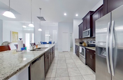 Take in beach and tranquility at this neighborhood home on the canal. Enjoy a dip in the saltwater pool or a soak in the pool spa - the lanai protects it all from the weather outside. There's plenty to enjoy at this fun home, where the family-friendly layout is perfect for groups looking to settle into comfort. The open kitchen features a prep island that also doubles as a breakfast bar - plus a helpful coffee station to make mornings go faster. The outdoor kitchen features a fabulous built-in grill and a minifridge perfect for storing both ingredients and beverages. Both the main bedroom and one additional bedroom feature desk workspaces perfect for completing remote work. Guests of the main bedroom can enjoy the use of an extensive en suite bathroom, featuring both a standalone shower and jetted tub for relaxation. All bedrooms feature room-darkening shades to ensure you can wind down for a peaceful sleep.