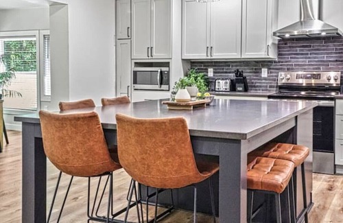 Bring out your inner chef in the fully stocked kitchen using pots & pans, cooking utensils, baking trays, baking dishes, and even a Belgian waffle maker. Gather at the dining table, set for up to 10 guests, with an additional 6 seats available at the kitchen island and 8 seats at the outdoor dining area.