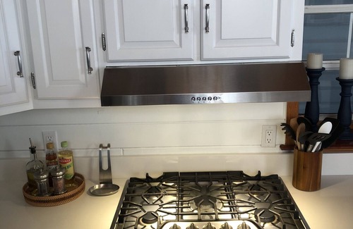 Upon entering the home, you are greeted by a spacious great room with knotty pine cathedral ceilings and open windows across the back of the home for a spectacular view of the water. The open kitchen plan boasts a large center island with extra seating, gas stove, built-in oven, refrigerator, dishwasher, microwave, air fryer/toaster oven combo, coffee makers (drip & K-cup), separate pantry and plenty of space for entertaining. Right off the kitchen is a separate covered patio where you can whip up a meal on the gas Blackstone Griddle and dine outdoors on the picnic style dining set.