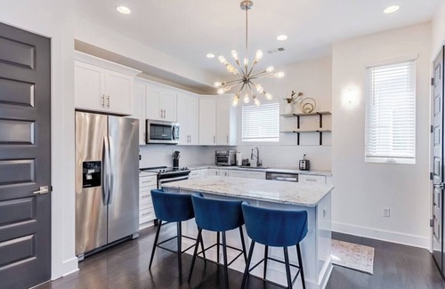 This sleek 3-bedroom, 3.5-bath home comfortably sleeps up to 11 guests and features designer finishes throughout. Relax in the open-concept living area or head up to the private rooftop patio for sunset cocktails and skyline views. A balcony off the main living space offers another perfect spot for morning coffee or late-night chats.