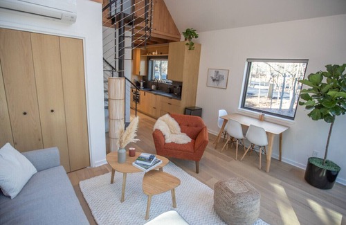 Hidden in the woods just feet from a seasonal creek, Shadow Bend is the perfect getaway for the discerning traveler. Though it is nestled carefully in nature, this modern cabin lacks no comforts or convenience. It has one queen bed upstairs, one full bed downstairs and one bathroom. Complete with a micro chef’s kitchen with luxury appliances, top-notch mid-century furnishings and fine Scandinavian-inspired finishes throughout, this 650 sq. ft. cabin offers a one-of-a-kind experience.