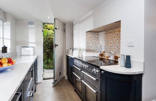 The beautifully renovated cottage is set in an enchanting garden teeming with wisteria and roses. Inglenook fireplaces, exposed beams and polished wooden floors are the backdrop to a charming home that is spacious, welcoming and beautifully furnished. Antiques mix with the contemporary furniture to create a setting that is relaxed, comfortable and stylish. This dual aspect cottage, with views over the open fields to the woods beyond, is bright and laid out with a spacious sitting room with a wood burning stove, a large dining room with an inglenook fireplace and several quiet areas, perfect for relaxing with a good book. The fully equipped kitchen comes with a Rangemaster stove, fridge and freezer, dishwasher and drinks fridge.