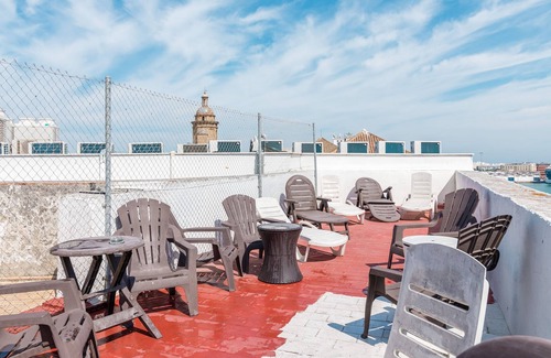 The spacious Calesas Apartment, measuring 120 m², is located in the center of Cádiz, a charming city known for its excellent climate all year round. Situated on the third floor of a 300-year-old building (without an elevator), it impresses guests with its rooftop terrace and wonderful views of the Bay of Cádiz. Numerous windows provide plenty of natural light. The apartment is designed to accommodate up to 6 people and includes a living-dining room with a sofa bed for 2 people, a well-equipped kitchen with modern appliances, 3 bedrooms (one with 2 single beds), and a bathroom. Additional amenities include Wi-Fi, air conditioning, washing machine, and television. The private balcony is ideal for starting your day with a cup of coffee outdoors, and the large rooftop terrace, 80 m² and shared with another apartment, allows you to sunbathe on loungers, prepare meals on the barbecue, and enjoy views of the sea and the charming towns of the Bay of Cádiz, such as El Puerto de Santa María and Rota. Thanks to its excellent location, there is a supermarket right across the street and, just 5 minutes' walk away, numerous shops, restaurants, bars, and a wide cultural offer. The beautiful beaches of Santa María del Mar and Playa de las Mujeres are only 700 meters or a 9-minute walk away.