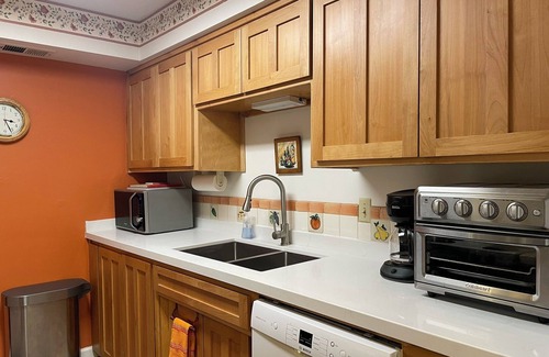 This charming condo is one of only four in the building, with Unit A boasting the most desirable layout in Bavarian Village. The ground-floor condo offers easy, step-free access, welcoming you into an open-concept living space. The common areas feature new luxury plank flooring, and the kitchen is designed for both style and functionality, with a breakfast bar, sleek quartz countertops, refaced cabinets, and top-notch appliances including an ultra-quiet Bosch dishwasher, air fryer, coffee maker, toaster, and microwave.