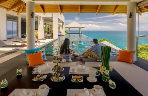 This exquisite oceanfront property is spectacularly situated high on a headland overlooking the Andaman Sea on the picturesque Cape Amarin between Kamala and Patong on Phukets scenic west coast. “House on the cliff by the ocean” is the appropriate translation of the Thai name for this superb nine-bedroom luxury villa designed by Paris-based architects Arte Charpentier.