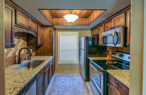 We have 6 identical 2 bedroom/2 bath condos in our building. Each condo is a spacious 1100 square feet with an open floor plan. The living area consists of a sofa with a queen sleeper, 2 recliners, large HDTV, Roku player, extended cable, CD player, and ceiling fan. The dining area has a table, a side bar that is fully stocked with barware, and sliding door access to the balcony. The kitchen has stainless steel appliances, granite countertops, bakeware, cookware, place settings, glasses, plasticware for children and for the grill, blender, toaster, and crock pot. There is a stove, oven, microwave, dishwasher, and refrigerator with ice maker.